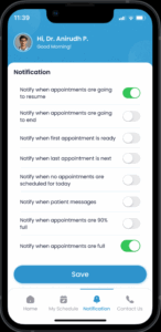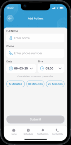 ● Doctor login with schedule control ● Add patients manually or accept them from app ● Set consultation time per patient ● Take breaks with 5/10/15 min options ● View and manage live queue